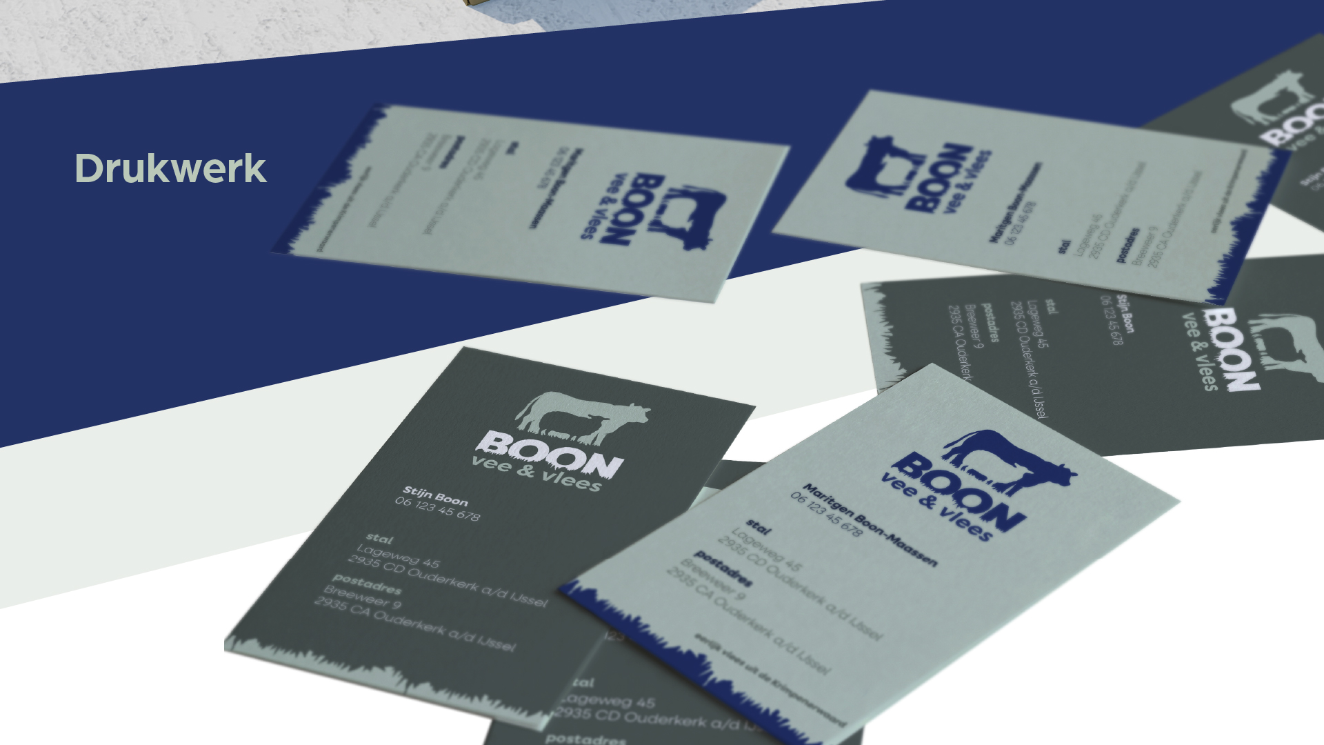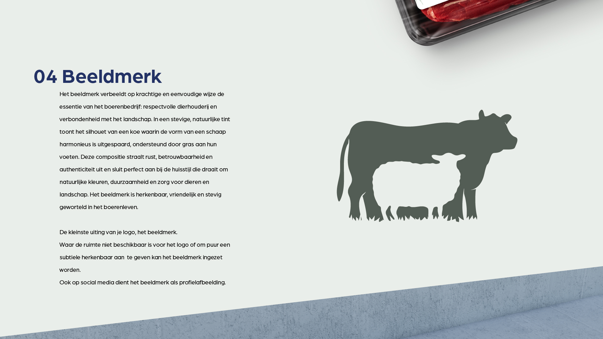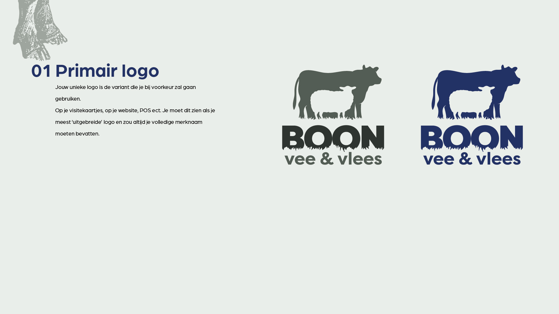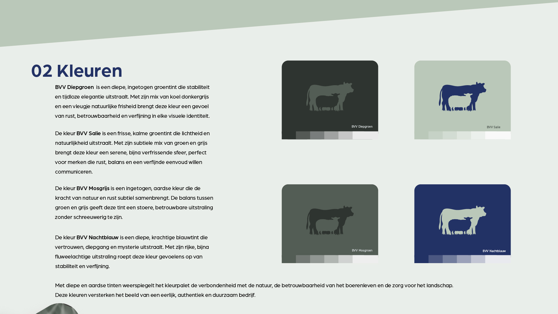 Met diepe en aardse tinten weerspiegelt het kleurpalet de verbondenheid met de natuur, de betrouwbaarheid van het boerenleven en de zorg voor het landschap. Deze kleuren versterken het beeld van een eerlijk, authentiek en duurzaam bedrijf.